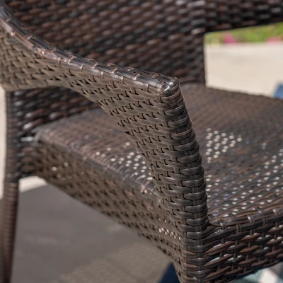 The beautiful blend of wood and wicker comes to life with this Christopher Knight Home Clint 7pc Acacia and Wicker Dining Set. Complete with six stacking wicker dining chairs, you can enjoy eating in your backyard whenever you want. The wooden table is treated to withstand even the harshest of seasons, ensuring your set looks great all year long. The rectangular table ensures that there is enough space for both food and people, meaning no one leaves the table hungry.