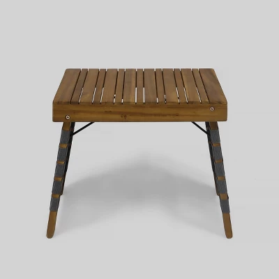 Give your outdoor seating a handy companion with our foldable side table that is designed for charming portability and reassuring reliability. This foldable option not only provides compact convenience but is also features a stunning woven look that instantly upgrades any existing décor. Constructed with gorgeous acacia wood, this table offers reliable durability that naturally withstands most weather conditions. Finished with exceptional water-resistant nylon straps, our table will provide a unique style that will last you for many years to come.